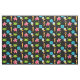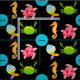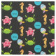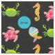 Fabric kids will love, features a black background with sea creatures including a pink sea turtle, striped fish, orange seahorse, and green crab as well as blue circles you can customise with a name.