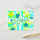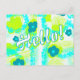 Customize this postcard with a message on the back and a photo on the front. Blue flowers with aqua and lime colors make an abstract image with "Hello" text angled across the front. Use the template on the back for your message, or remove all text.