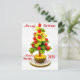 Christmas tree made of lettuce leaves strung on a wooden skewer. Cherry tomatoes are used as decorations, and red pepper is used instead of a star at the top. The tree is mounted on a stand made of a slice of pineapple. Personalized text.