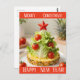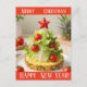 Christmas tree made of lettuce leaves strung on a wooden skewer. Cherry tomatoes are used as decorations, and red pepper is used instead of a star at the top. The tree is mounted on a stand made of a slice of pineapple. Personalized text.
