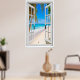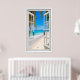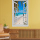 Ocean view fake window. Beach and palm trees scene, for a windowless office wall. Fun, realistic optical illusion scenic poster for an office or study wall.