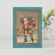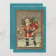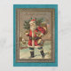Beautiful, unique, classic, trendy, pretty and decorative antique looking Christmas greeting card on a vintage teal blue colored background, with image of a smiling and good-natured Santa Claus, walking through the December winter season snow, carrying a knapsack full with gifts and presents, and "A Joyful Greetings" text. With heartfelt poem message on the backside of the card, which can be customized or personalized with a personal text and signed with your family name or individual family member names of your choice.