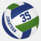 These custom volleyball themed round stickers for girls or boys feature the realistic image of a volleyball that has green, blue & white panels upon which you can customise the player's name & jersey number in a varsity letter style font - by katz_d_zynes