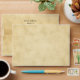 An elegant wedding monogram design in black and white on a vintage style background image design to look similar to old paper or vintage parchment, a background image in yellowy beige and sandy fawn colours with a mottled look to the pattern. This has template spaces for the bride and groom names and a nice swirly script style custom initial letter in white. A nice vintage style themed design with a stylish old fashioned look.