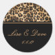 Round wedding sticker shown in a black and safari leopard print. Customise this sticker with your names and date.