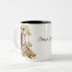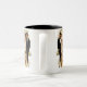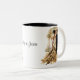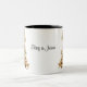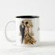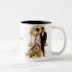 This custom name wedding coffee mug is shown with sample names and a bride and groom art print.