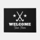Custom welcome door mat with field hockey sticks and ball logo. Black and white entry rug with personalised family name or personalised text. Athletic typography with sporty logo. Available in small and large size. Customisable colours. Great for home or sports club