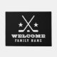 Custom welcome door mat with crossed ice hockey sticks and puck. Black and white entry rug with personalised family name or personalised text. Athletic typography with sporty logo. Available in small and large size. Customisable colours.