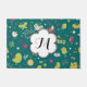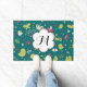 Whimsical Birds and Butterflies doormat featuring a beautiful, colourful, artistic and whimsical design of birds, butterflies, flowers, hearts, and x's. This pretty design features birds and butterflies of wine, green, and gold on a teal background. This fun, colourful, whimsical door mat features a white flower shape banner that you can easily personalise with your monogram initial!