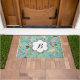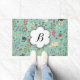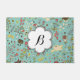 Whimsical Flower Garden, a beautiful, colourful, fun, whimsical design of cream, dark brown, coral, blue, and green flowers and birds on a pretty aqua blue background. This fun, colourful, whimsical door mat features a white flower shape banner that you can easily personalise with your monogram initial!