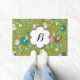 Pretty, colourful, cute, whimsical describes our Whimsy Tweety Birds on Vines design doormat. Features little birds of teal, wine, white, and pink on aqua vines with little white flowers, pink swirls, all on a green background. This fun, colourful, whimsical door mat features a white flower shape banner that you can easily personalise with your monogram initial!