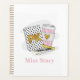 This pre kindergarten teacher planner keeps your lesson plans on one place. Pattern has a white notebook with black polka dots, a gold pk, heart coffee, ruler, pen and pencil. This white notebook with black polka dots design can be found on other items in my shop, PageCreativeDesigns.
