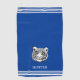 Custom white tiger image, blue three stripes and hunter text on royal blue. Text can be personalised. Elegant modern towel.