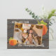 Unique, classy, trendy, pretty and decorative Thanksgiving holiday card. Cute WITH LOVE FROM text and room to customise or personalise with a photo and names (or family name) of your choice. With cute classic orange pumpkins on a weathered looking grey rustic farmhouse inspired barnwood planks pattern background design. And a customisable season greeting poem on the backside of the card.