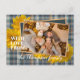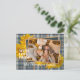 Unique, classy, trendy, pretty and decorative Thanksgiving holiday card. Cute WITH LOVE FROM text and room to customise or personalise with a photo and names (or family name) of your choice. With cute classic warm yellow fall Mums flowers pumpkins on a teal blue, ochre mustard brown and grey coloured rustic farmhouse inspired plaid tartan pattern background design. And a customisable season greeting poem on the backside of the card.