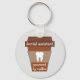 This keychain displays a brown coffee cup with the text "dental assistant - powered by coffee." There is a white tooth in the centre displayed on the cup sleeve.
