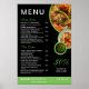 Create a professional and eye-catching menu for your café, bistro, or small eatery with this fully customisable restaurant menu poster. Featuring a sleek black background, stylish green accents, and space for up to 10 dishes, this template is perfect for showcasing your food offerings in a polished and modern way. All text, pricing, and images can be edited to match your cuisine - whether you're serving pasta, sushi, burgers, or plant-based dishes.
