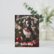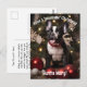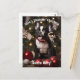 Introducing the "Festive Furry Duo postcard"! Picture a charming flat card that perfectly encapsulates the heartwarming joy of the holiday season. On the front, a delightful image unfolds — a white and black French Bulldog puppy sitting in front of a beautifully adorned Christmas tree. The playful pup, with its tongue happily out, creates a scene of festive bliss, surrounded by vibrant red Christmas tree baubles.