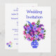 A chic, modern Wedding Invitation from the Bride and Groom, with a vase of pink , blue and mauve flowers, from the 'Flower Power' handpainted paper collage range by Judy Adamson. Fully and easily customisable.