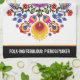This kitchen towel features a vibrant and intricate design inspired by Polish folk art. The artwork is symmetrical and showcases a variety of colourful flowers and leaves, arranged in a traditional folk pattern. The background is a deep red, which makes the bright colours of the flowers stand out beautifully. At the bottom of the towel, there is a customisable text area that currently reads "FOLK-ING FABULOUS PIEROGI MAKER."