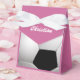 Soccer sports design with a close up image of a soccer ball, fully customisable with your own name or text. Perfect for the soccer player or soccer fan as a party favour box for their soccer themed birthday with a Thank You message on the bag. The background is pink with the Thank you message also in pink, which can be changed to the colour of your choosing.