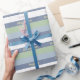 Horizontal pastel light blue, light green and dusty blue striped pattern and customisable text: Happy Easter. Click edit to change the text and name to your liking,