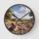 • This customisable clock features a cheerful French Bulldog on a peaceful lakeside with natural rocks, lush greenery, and a cosy cabin in the background.