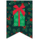 This customisable swallowtail "Merry Christmas!" holiday party bunting has a background of dark green with gren and red holly and berries pattern on it with white lettering that you can personalise how you want. There is also a wrapped green and white gift with red bow in between the two words. Use the blue edit design to enter the design tool area to change the font, font colours, etc.