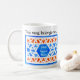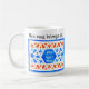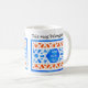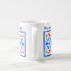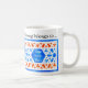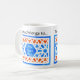 A pretty white mug with a traditional Islamic trellis pattern in blue, orange and white, back and front. The text around the rim says, 'This mug belongs to...' in black lettering and there is a panel in the middle of the design where you can put the name you require. This design was handpainted by Judy Adamson.