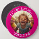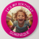 Customisable photo and name - IT'S MY BIRTHDAY - button. Hot pink frame with white text.