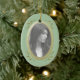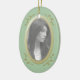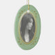 Soft Green with Gold Leaves Oval Photo Ornament Create a cherished memory of someone special with a customisable photo ornament. Designed especially for remembrance and memorial keepsakes, this ornament has a soft green background with a gold look photo frame to which you can add a photo of your loved one. A golden leaf detail surrounds the frame. On the reverse is the text 'In loving memory' and customisable text boxes to add a name and dates. A lovely way to remember and celebrate a life. Available in a range of soft and classic shades for male or female memorials.