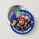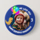 Customisable photo, name, age and text - HAPPY BIRTHDAY / WE LOVE YOU - button. Blue frame with white font and a cute dino is holding balloons. Adorable keepsake.