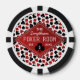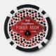 Create your own custom poker room / poker club chip set using this cool, easy template. The background has a pattern of playing card suits (spades, clovers, hearts, diamonds). Over that, there is a black ribbon graphic with a red diamond where you can add all your details in white, including your name, the year your home casino was established and a monogram letter. All text is customisable, including "POKER ROOM" in case you want to change it to POKER CLUB. Using the templates, your text will change on both sides of the chips. To make more detailed changes, "Customise It."