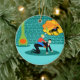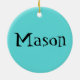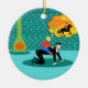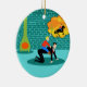 Yeehaw! You'll be ready to ride off into the sunset with this Customisable Retro Little Cowboy Ceramic Christmas Ornament. This whimsical design features a vibrant, 1960's style, minimalist, cartoon drawing of a father and his young son having rip-roaring, good time. The scene takes place in their mid century modern living room, which has an aqua floor and a wall of teal and aqua bricks. The rowdy youngster is wearing a red shirt, blue jeans, and brown cowboy boots. That's the perfect attire for getting a make believe horsey back ride from his indulgent father. Dad appears to have just arrived home after a long day at the office. He is wearing a black suit, white dress shirt, and red tie. He still has the energy to crawl around the room on all fours, while his favourite blonde cowboy enjoys riding the range. But the young cowpoke has his mind on another time and place. With the help of a thought bubble, we can see exactly what is on Junior's mind. He is envisioning himself riding through a yellow and orange desert on a sleek, black stallion. The cowboy of his mind is wearing a brown cowboy had to protect him from the searing sun. Behind him is a green cactus, which is eerily reminiscent of the green cone fireplace back in his own family home. I imagine that both horse and rider are working up a real appetite for dinner at a chuck wagon. Where is Mum with that dinner bell? The opposite side of this holiday ornament is aqua and can be personalised.