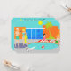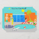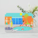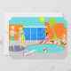 Come on in! The water is fine! This customisable Retro Pool Party Invitation features a vibrant, cartoon drawing of a fun and sophisticated pool party. The mid century modern design centres around a round swimming pool on a large, grey, concrete patio. The pool is filled with turquoise water. Orange brickwork surrounds the pool and there is a white, plank diving board all ready for an adventurous soul. A red and white beach ball is floating in the water. On the opposite side of the pool, two party-goers are dangling their feet in the water, while resting on red and white striped beach towels. The woman with black hair is wearing a pink, one-piece swimsuit. Beside her is a tropical drink in a coconut with a little umbrella and a green straw. The blonde man is wearing bright, green trunks. He is kicked backed with his hands behind his head. To the left of the pool, is a distinguished man with white hair and jade swim trunks holding a drink in a coconut shell. We know he's distinguished because he's a man with white hair! He is talking to a woman with blonde hair and an hourglass figure wearing a turquoise swimsuit. Slung across her arm is a yellow beach towel. Behind this scene is the green silhouette of a palm tree and a futuristic, orange, brick house. Through the large, floor to ceiling, blue glass windows, you can see the silhouette of a television, chair, ottoman, and starburst clock. The sky behind the house is a cloudless turquoise with a round, yellow sun. The opposite side of the invitation is turquoise and has plenty of room for customising with your party details. These invitations are sure to make a splash!
