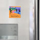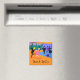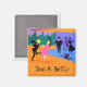 This Customisable Retro Urban Rooftop Party Magnet is intoxicating in its detail. The cartoon design features the type of wildly sophisticated cocktail party that is normally only seen in movies from the 1960s. There is a lot for the partygoers to take in. From the comfort of a penthouse apartment, guests are enjoying the view and the ambiance. The lighting sets the mood and we are able to see the darkened silhouettes of an attractive couple dancing the cha-cha. On the floor, there is a purple, portable, record player at the feet of the dancing couple. Several albums have been scattered nearby. Even with the dimmed lighting that makes practically everything in the room appear in shades of purple, blue and black, we can tell that everyone is dressed to the nines. Behind the dancing, indoor couple, there is a gentleman in a black suit holding a martini glass. He is talking to a dark haired beauty who is standing near one of the floor to ceiling glass walls. From a lampstand, a single bulb is casting a romantic glow on the scene. The only thing missing is the lampshade. Hmm... Where is the shade? It's on the head of a tipsy man who has taken the party outside to the orange rooftop. He's clearly got some fine dance moves and he isn't afraid to show them to the world! His companion is a shapely, blonde woman in a bright pink dress. Her back is arched as she throws back her martini in an uninhibited fashion. Beyond the party, there is a breathtaking teal skyline, complete with skyscrapers and a purple sky. If this is how the other half lives, sign me up! Personalise this magnet for a one of a kind gift.