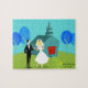 This Customisable Retro Wedding Couple Puzzle will have you hearing wedding bells. The 1960's style, minimalist art design features a bride and groom on their wedding day. The happy couple looks good enough to be standing atop a wedding cake. But they aren't. They're standing on lush, green grass. The debonaire Mr. is wearing a classic, black tuxedo with black bow tie. Down, ladies! He's taken! He is holding the hand of his beautiful Mrs., who looks positively radiant in her tea length, white gown with form fitting waist and flared skirt. She truly looks like a princess with her tiara and gauzy, white wedding veil resting on her pretty blonde head. Beside them, a path in the grass leads to the world's most charming chapel. The quaint, teal and turquoise church is the perfect setting for saying, "I do!" Yes, here is the church. Here is the steeple. We can only assume that, behind those bright red, double doors is a roomful of people just waiting to share in this couple's happiness. The picturesque setting also includes four, stylistic, cartoon trees in shades of blue. It's a beautiful day for a wedding, as we can see from the flawless aqua sky. The only thing missing from this mid century modern design is the rice, and we can assume that will be forthcoming. Personalise with names and date. This design is great for congratulating your favourite newlyweds.