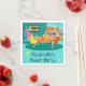 These customisable Retro Women's Weekly Card Game Disposable Napkins feature a cartoon drawing of four mid century modern women at a hen party. They are socialising in a stylish dining room. On a turquoise and teal brick wall, there is a Mid Century Modern Globe Art Stretched Canvas Print available from StrangeLittleOnion's Zazzle store. My, they have good taste! Through sliding glass doors, we can see the lush, green lawns of suburbia. Across the street, there is a sleek orange house with a pink and white car parked in the carport. Back in the dining room, three women are seated at a round table with an orange tablecloth. There is a redhead in a yellow dress, a brunette in a green dress, and a blonde in a red dress. They are holding cards in their hands. Four teacups are on the table just waiting to be filled by the raven haired hostess in a pink wiggle dress. She is carrying a tray with a tea carafe perched on top of it. All of the women are having a wonderful time, but they should probably keep an eye on the blonde. If that card she's holding behind her back is any indication, she cheats! Two yellow starbursts surround writing at the bottom of each napkin. Simply replace the existing text with your own words for napkins that will "wow" your guests!
