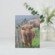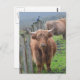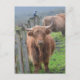 Adorable highland cow standing beside a fence.