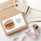 Add a slogan or name to create a personalised gift with a hamburger theme. Image shows a double cheeseburger with melted cheese, tomato rings and gherkin.