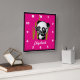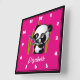 Cute and adorable illustration of a black and white panda bear sitting amongst the green bamboo stalks in a little grove, looking happy, friendly and loveable. Hot pink background.