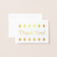 This thank-you greeting card design features the message "Thank You!" on the front in gold foil, along with a customisable message on the inside. It also features decorative diamond shapes. It could be used to show gratitude to somebody who has done something special.