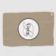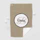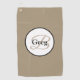 The customised tan brown and white golf towel has a solid brown background with a large white circle design outlined in black. The last name monogram letter is centred in circle along with the full first name in black This golf towel is great personalised gift for all golf players on Birthdays, Father's Day and more!