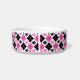 This cute pet dish displays a pink and black argyle paw print pattern and a space to add your pet's name.