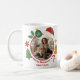 Make your coffee break festive with this customizable white ceramic mug, the perfect gift for pet parents this Christmas! The design features a cheerful holiday wreath illustration, including classic elements like a Santa hat, Christmas tree, holly, and ornaments, surrounding a circular frame. You can personalize the mug by adding a favorite photo of the recipient with their beloved cat, dog, or other pets. The design is completed with festive text, customizable with the recipient's name (e.g., Dear Laura) and a "Merry Christmas" greeting. This sturdy mug is ideal for enjoying hot cocoa, coffee, or tea throughout the holiday season, making it a thoughtful and personalized present.