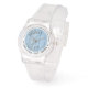 I only have one complaint. I ordered the watch with clear case and strap, and what was sent was white case and strap. I'm going to keep it because 1) it looks very nice in white, and 2) it would take too long to get a replacement made and sent in time for my occasion. Aside from the mix up with the color, the watch does look very good in white. The purple dial is actually sparkly which did not show in the online images. That was a nice surprise. If you like Swatch watches this is very similar to those. It's 33.6mm in diameter, 10.5mm thick, and 40.6mm lug to lug. Stainless steel case back says 3ATM/30m WR, so no swimming or showering or submerging this one. If you like Woodstock, this is a great choice.