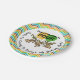 Little Monkeys 4th birthday party paper plates features three monkeys that are oh so cute, swinging from a tree branch, birthday balloons of yellow and green, text that reads This Lil' Monkey is FOUR, and has a wide border of chevron stripes in aqua blue, lime green, orange, brown, and white! You can easily add a thank you message or other text to these cute monkey birthday paper plates!