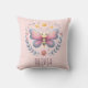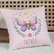 This whimsical personalised pillow features a smiling butterfly with stunning pink and grey wings. a delicate circle of botanical elements surrounds this charming pillow.