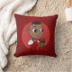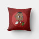 Throw pillow with an illustration of a cute smiling African American baby holding a Christmas present; in a red circle on a red background, a Christmas holidays design