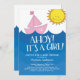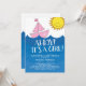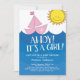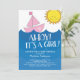Fun Nautical Ahoy it's a Girl baby shower invitation featuring a smily face sun with a pink sailboat with anchor with modern hand lettered typography